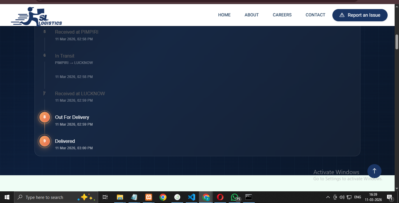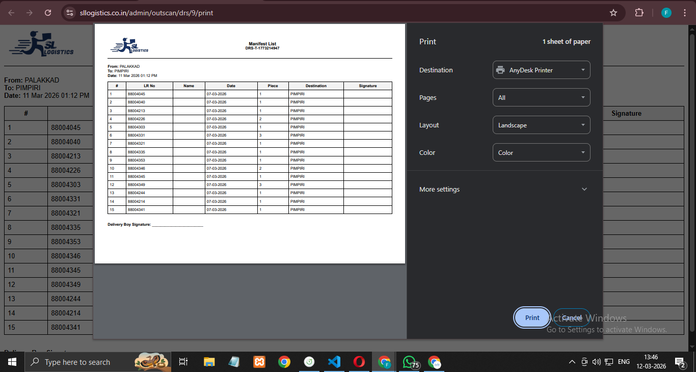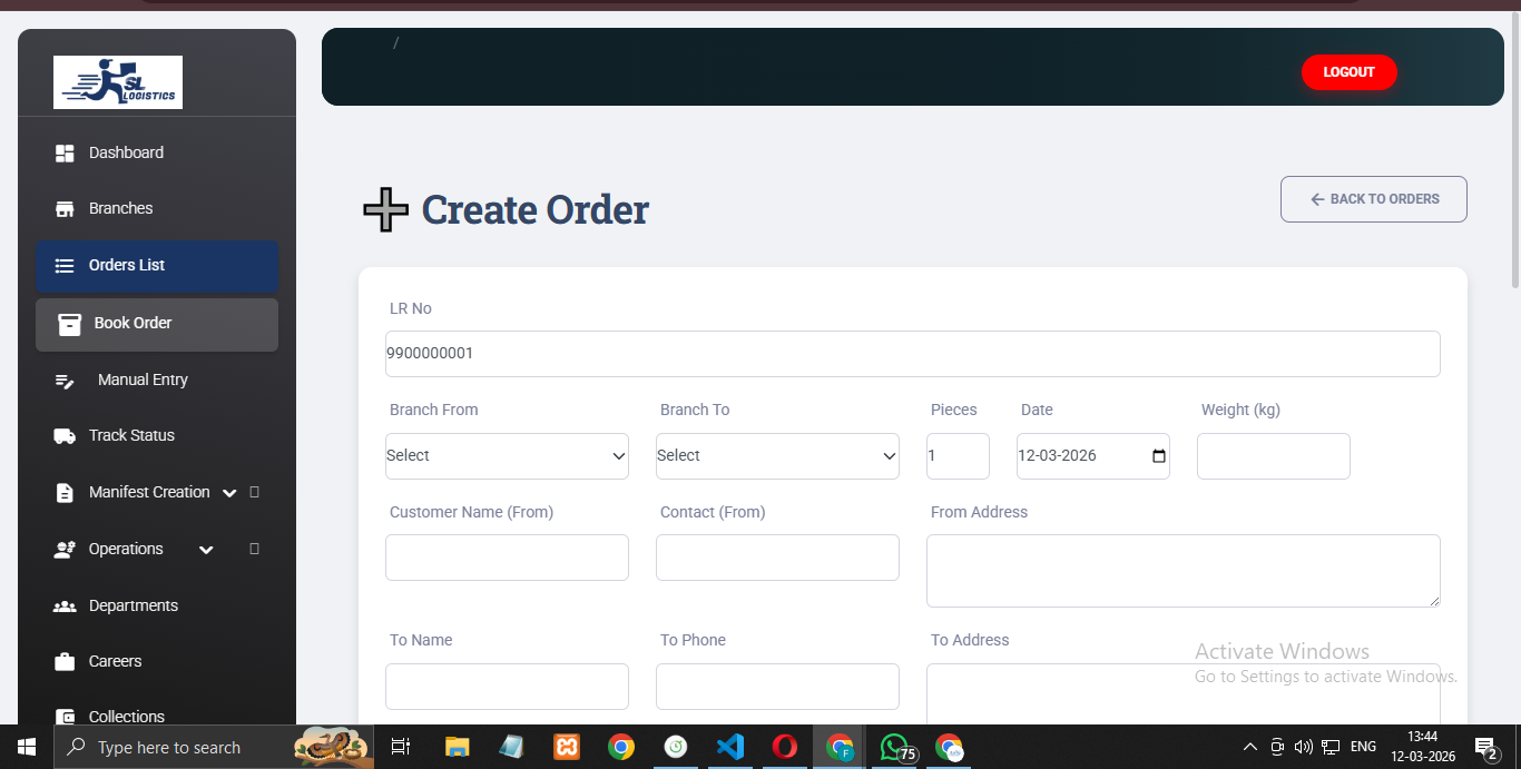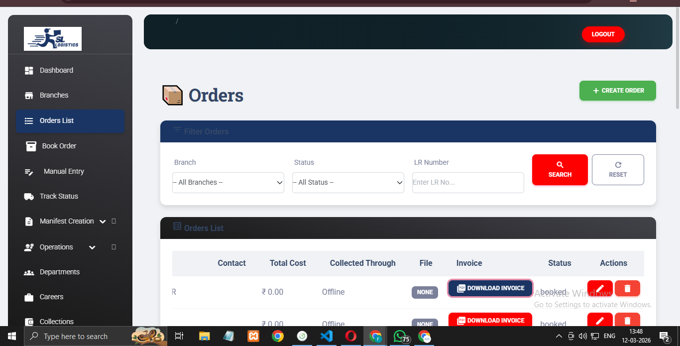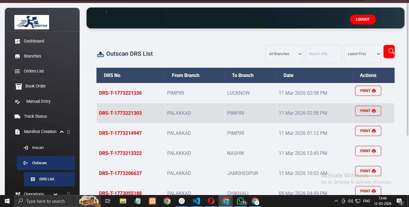 A web-based application developed to manage multi-branch logistics operations. The system includes order creation, invoice generation, manifest and DRS printing, shipment tracking, inscan/outscan processes, and role-based access for admins and branch staff, helping logistics companies streamline their delivery operations.